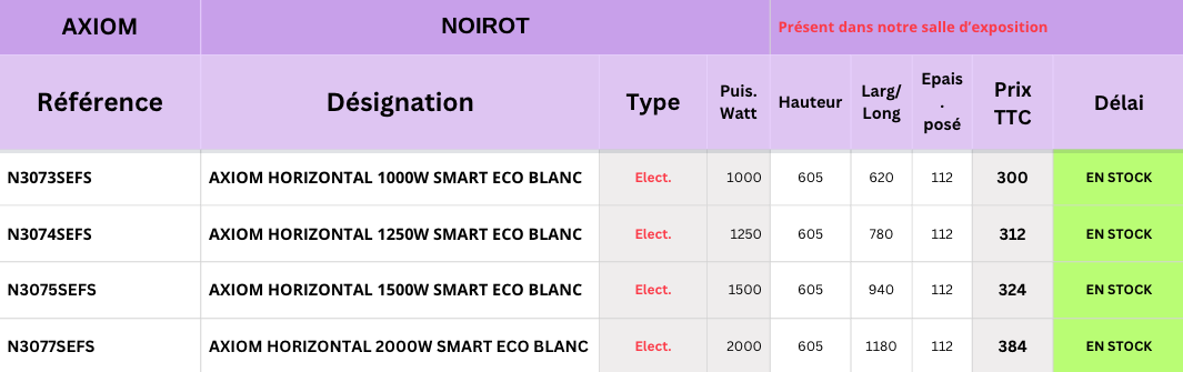 | Déclinaisons | ref | Désignation | Hauteur | Larg/Long | Ep posee | Puissance | Poids | Type | Prix TTC | Stock |