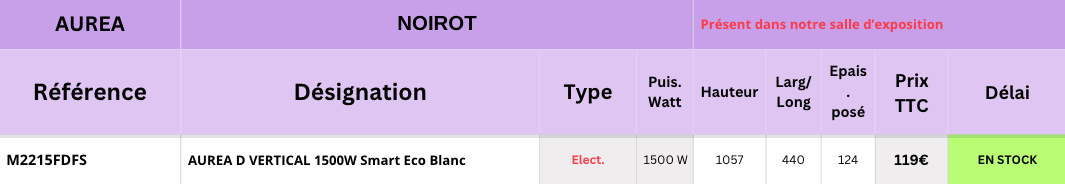 | Déclinaisons | ref | Désignation | Hauteur | Larg/Long | Ep posee | Puissance | Poids | Type | Prix TTC | Stock |