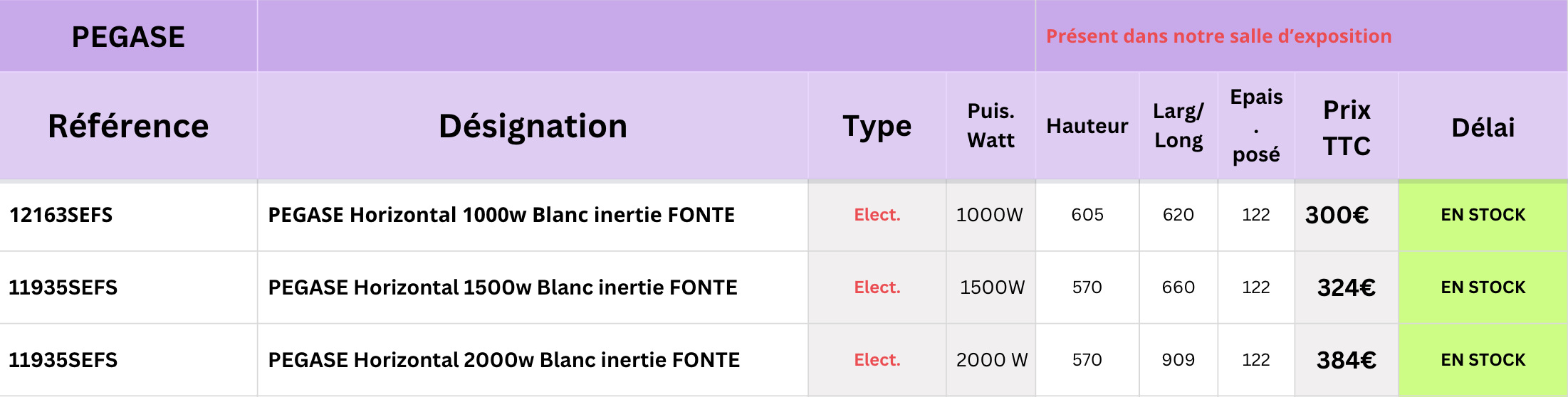 | Déclinaisons | ref | Désignation | Hauteur | Larg/Long | Ep posee | Puissance | Poids | Type | Prix TTC | Stock |
